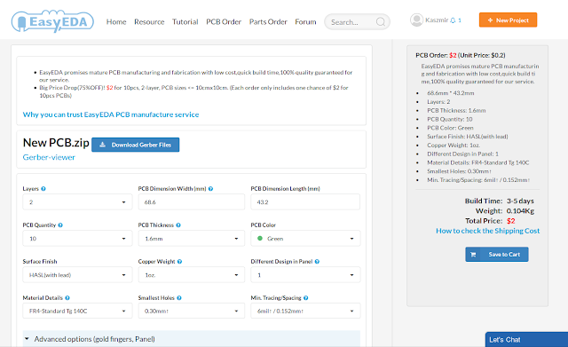 Ostatnią bardzo bardzo miłą niespodzianką dla hobbysty jest cena za wykonanie płytek :) Poniżej parametry płytki dla mojego projekciku i cena wykonania 10 szt płytek.